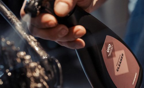 Use by spraying UFO Drivetrain Cleaner to your chain, cassette, and chainrings and scrub with a brush to break down surface contaminants, waxes, or grease. Let sit for 3-5 minutes for the best results. Rinse thoroughly with water. UFO Drivetrain cleaner is activated with water and will turn milky white first and then when the chain is clean, the water will be clear again.