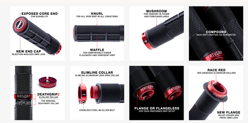 Millimetre-perfect positioning of mushroom, waffle, and knurl for the ultimate grip pattern.Deathgrip2s are designed for optimal grip, comfort and control whether you ride with or without gloves. They’re the perfect choice for every rider – for weekend thrashers, dedicated freeriders, or whether you race Hardlines, World Cups, or ride Rampages. Deathgrip2s are the grip of choice for everyone.