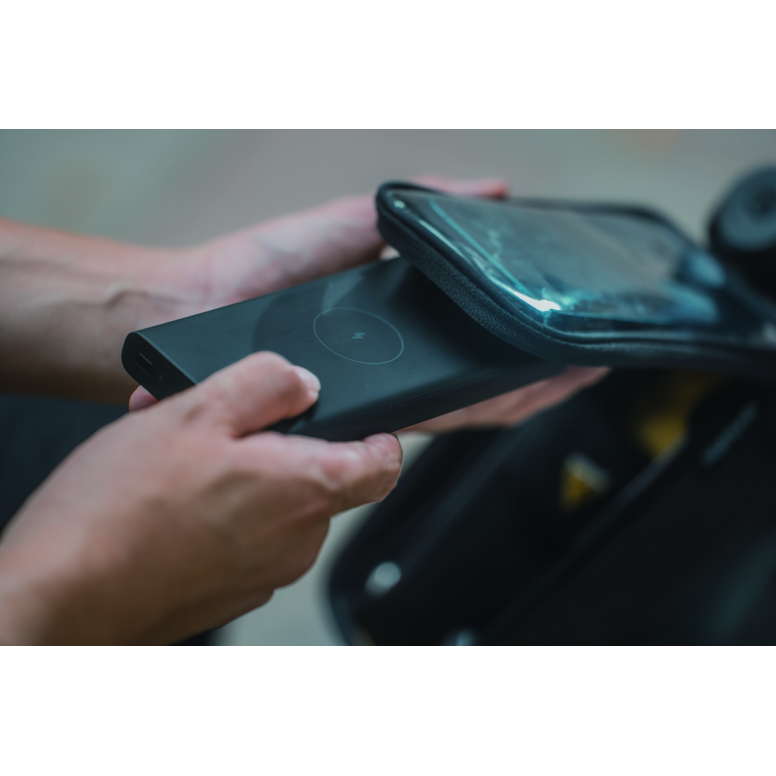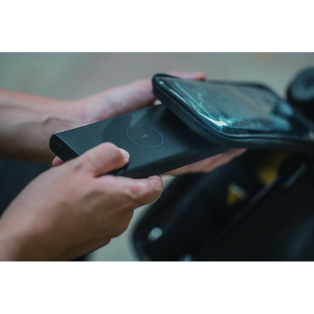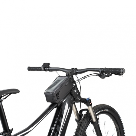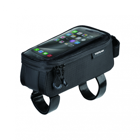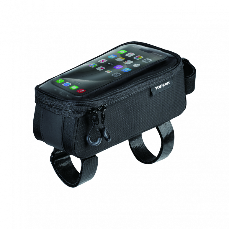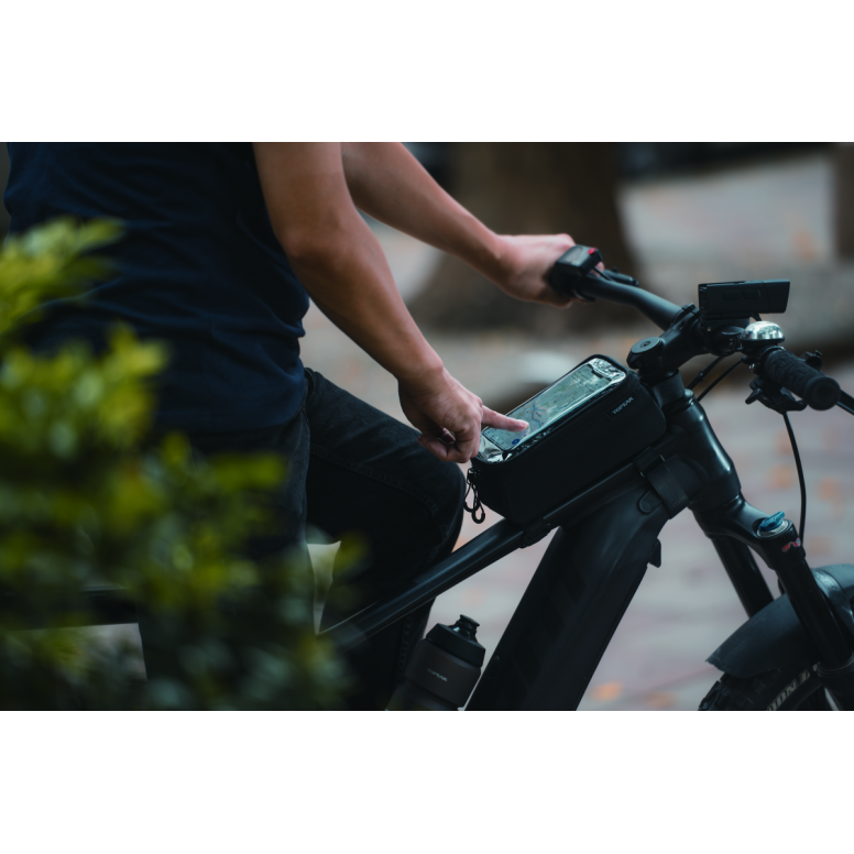 A top tube bag and phone case 2-in-1 design, featuring a transparent protective film that allows you to operate your phone while it's inside the bag.